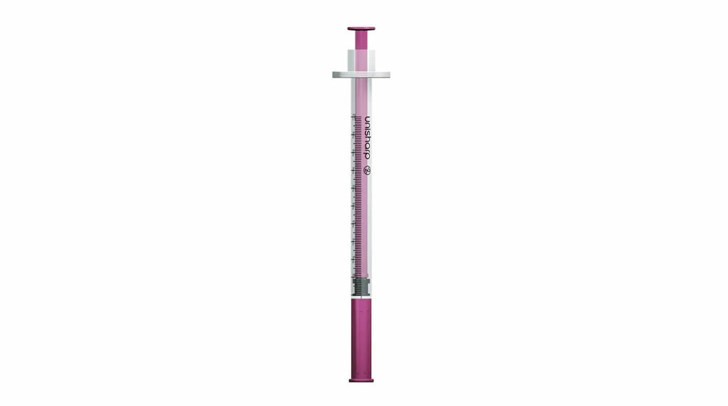 5 x High quality, 1mL fixed needle low dead space syringe with volume markings in mL rather than insulin units.